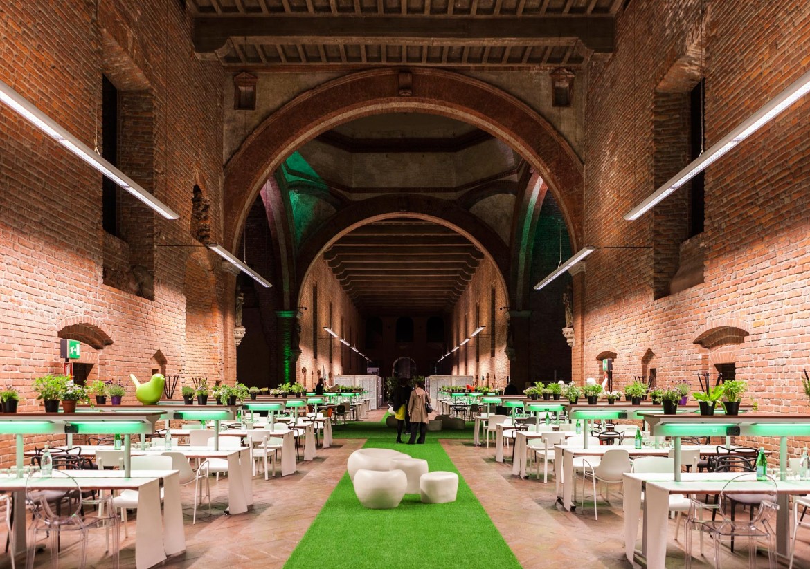 Nella sera del 13 aprile, primo giorno di apertura della mostra-evento Energy for Creativity, si è svolta la cena inaugurale, organizzata da Interni negli spazi monumentali della quattrocentesca Sala della Crociera (oggi adibita a biblioteca). Circa duecento ospiti hanno affollato l’area riservata all’evento, allestita per l’occasione dall ’architetto Marta Giardini secondo un’ispirazione che ha guarda to alla natura. Per il pa vimento è stato scelto un rivestimento in erba sintetica di Limonta Sport, Fiori di Latt a ha fornito i papa veri decorativi in metallo rosso, Serralunga i tavoli Alice con il piano a forma di margherita, mentre erano del Laboratorio dell’Imperfetto le sedute a forma di sasso Uluru e a sag oma di tronco Olmo. All’ingresso gli ospiti sono stati acc olti da una fresca frag ranza di prato studiata da Mr&Mrs Fragrance; i tavoli sono stati arreda ti con sedute di Gervasoni 1882, Kartell, Opinion Ciatti , Casprini, De Padova.